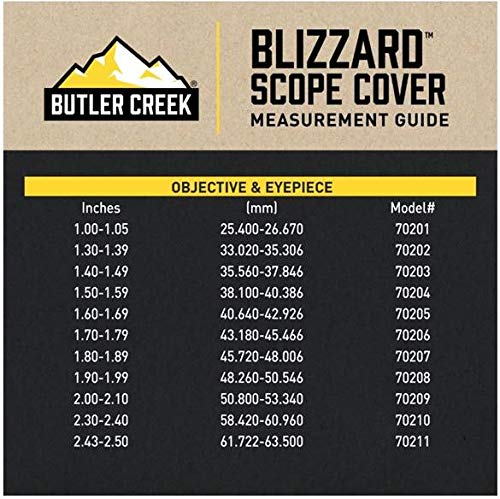 Butler Creek Scope Covers. BLIZZARD SCOPE COVER OBJECTIVE EYEPIECE Size Inches mm Model 1 100-105 25400-26670 70201 2 130-139 33020-35306 70202. Blizzard Scope Lens Covers InfoOrder 200-70201 Blizzard.